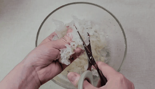 3、银耳撕碎,入锅,大火烧开后转小火炖20分钟;