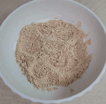 5、炒好的食材打成粉,倒入之黑芝麻酱,少量多次添加蜂蜜,抓拌和匀;