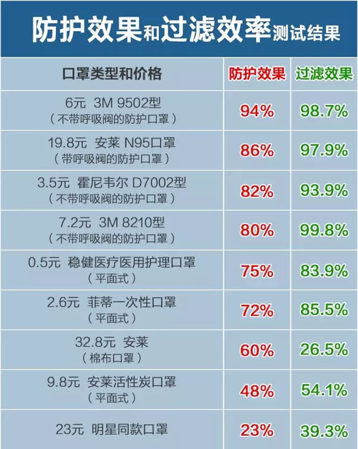 在测试中,不带呼吸阀的3M 9502型口罩表现最好,防护效果达到了92%,价格也处于中等,只有6元。