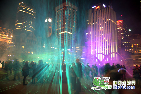 TD Bank 塔正在上演“SOON”,在强烈的音响的配合下,探照灯在每个人的身上闪过,照到你的身上,你就要赶紧跑……