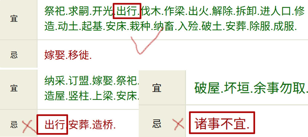 所有人都希望自己外出旅行一切顺利,我也不例外。选择出行日期,如果时间很紧没得选那就算了,但如果日期有得选又不知道如何选,那你可以查黄历选适宜出行的日子(即选“宜出行”的日子,不要选“忌出行”或“诸事不宜”的日子)。黄历是有算法的,那是根据天干地支及24节气12神煞等因素计算出来的历法,从汉朝发展至今已有2千多年的历史,存在则必然,即便不信也没关系,旦求心安。