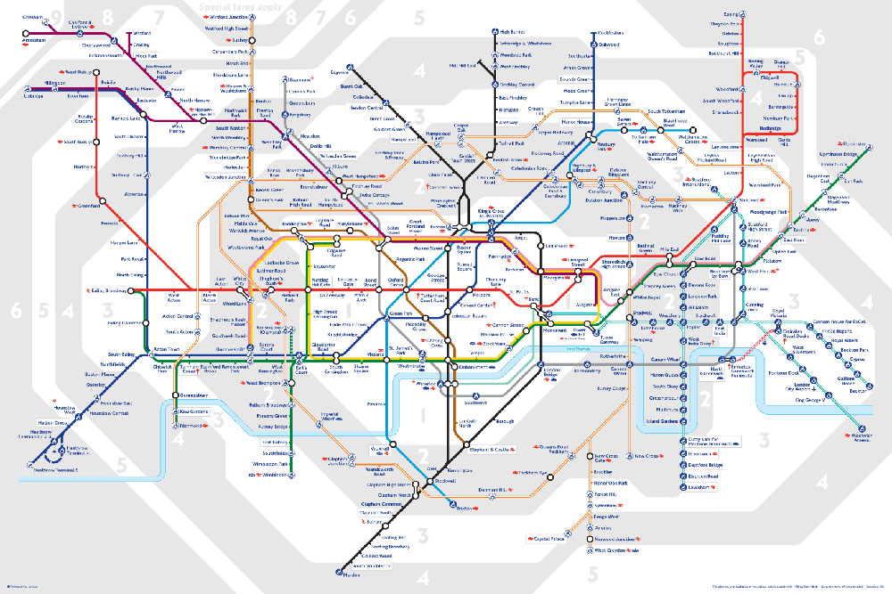 英国伦敦的地铁系统被称作“Tube”,这个地图叫“Tube Map”(点击这里看放大版地图)。Tube系统比多伦多TTC系统复杂多了,线路也很多,而且整套系统分设在不同的区内(Zone,见此图的灰色背景和灰色数字),地铁票的价格会根据Zone不同而价格不同。