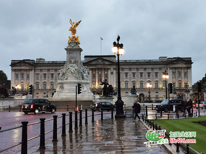 当我们走到白金汉宫的时候,雨暂停了一会儿。白金汉宫门前的雕像被雨水冲洗得铮明瓦亮,阴暗的天空中,那一抹金黄色显得格外耀眼。