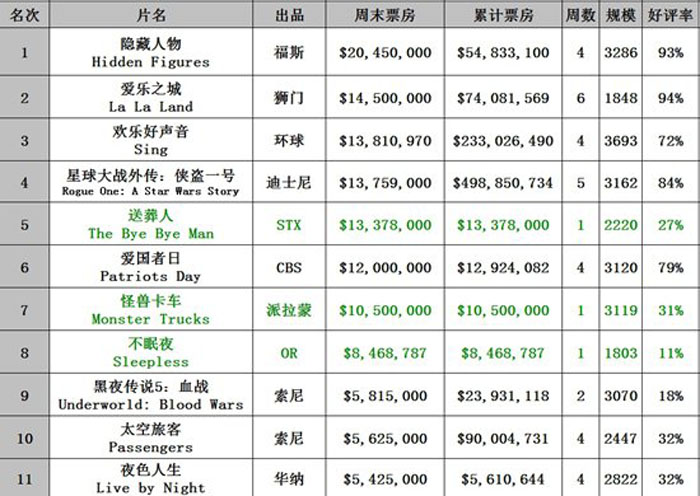 上周末,北美电影市场出现了开年以来罕见的新片扎堆的盛况,但所有新片的票房却全军覆没,几乎制造了一场令人费解的周末票房惨案。前一周在票房上出现井喷局面的黑人题材电影《隐藏人物》,意外成为上周的票房热点。这部好评率高达93%的影片,在扩映到3286家影院之后,最终以2045万美元的进账登上北美周末票房冠军宝座,本土票房业已累积到5483万美元。该片因为夺目的票房成绩而有望成为奥斯卡颁奖季的一匹黑马,有望在未来一个多月内对其他热门种子选手构成威胁。