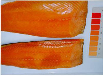 我们在超市挑三文鱼的时候,可以通过看颜色来判断三文鱼的好坏。要知道,在三文鱼的产地,买卖鱼实际上是以色论价的。那是因为三文鱼的颜色和其营养价值成正比,颜色越深,价值越高。因为颜色越深,其含有的虾青素含量越高。