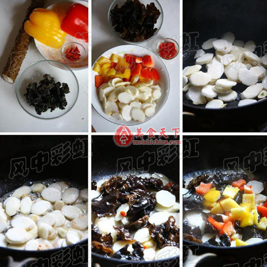 原料:山药1根、干木耳10克、甜椒少许、枸杞子10粒。