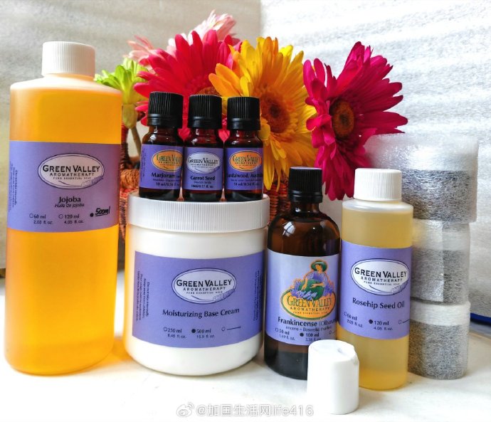 如何选择Green Valley 产品:Green Valley 的官方网站是:http://www.57aromas.com/。大家找到相应的产品,选择不同的容量,查看相应的价格,记下想要的产品(包括容量和数量)。GV家的产品是按照精油(Essential Oil)、基础底油(Carrier Oil)、基础底霜(Base Cream)、花水(Hydrosol)等进行分类的,网站全是英文的,如果想看中文介绍的话,小编这里有已经写的文章,包括:花水(详情请戳这里)、基础保湿霜配成的日霜晚霜和关节炎霜(有关Moisturizing Base Cream 的更多详情请点击这里)、眼霜(如何DIY 制作去细纹去黑眼圈乳木果眼霜?)、精油(请看精油专栏的系列文章)、去痘三步曲(如何去痘及配方)以及单方精油的介绍(请点击这里)、洗面奶(请点击这里)。大家下单前最好请做些研究,这样才能对自己想要的产品做到有的放矢。如有不懂的地方,请向小编咨询。最新增加的精油产品:湿疹起因及治疗方法 用乳木果调配祛湿疹霜很好用。另外,拼邮活动也接受国内朋友的订单,所有产品都可以预订,费用要加上寄国内的国际邮费、海关税、人工费和国内快递费。具体详情请通过微博(加国生活网life416)或微信(life416_com)咨询。