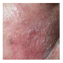 第一位,这是位老人的面部皮肤。老人常年卧床,身体不佳,近日突然面部变成这种状态,皮损严重。