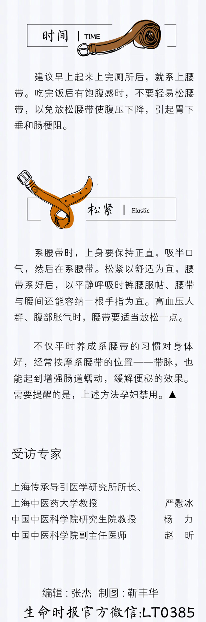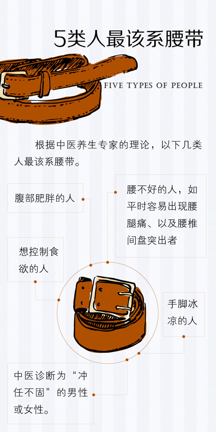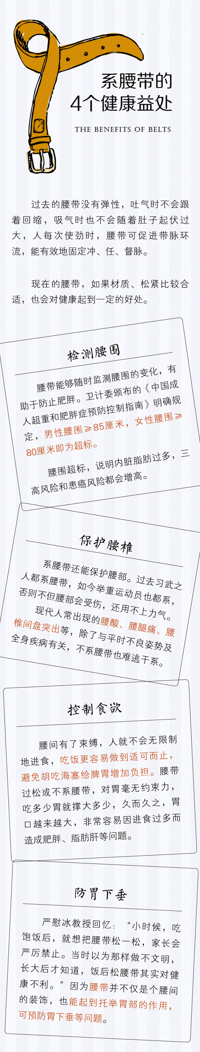 随着A字裙、松紧裤以及各类宽松服饰的流行,腰带似乎被打入冷宫:很多服装不需要腰带,有腰带也是作为装饰使用。不系腰带,腰上没了束缚,似乎舒服了、省事了,却可能有损健康。《生命时报》采访专家,给你一个重新爱上腰带的理由。