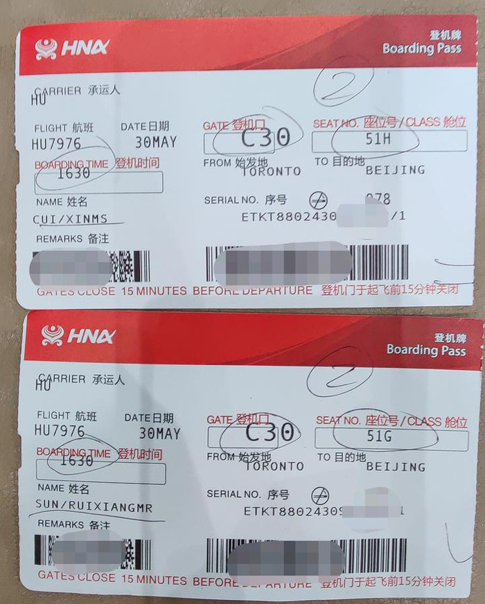 从预定机票之日起,我们就天天关注航班动向,生怕有什么变故。海航(多伦多-北京)直飞原本是每周两班,5月初海航突然取消周三航班。我们恰好预定的是另一次航班,算是躲过一劫,但目的地已由北京改为西安。那些天看到回国航班大面积取消的通知,我们能够成行很是幸运。多伦多急于回国的华人很多,中介机构组织了一个“登机群”,大家交流信息、解答疑难、分享经验,很是热闹。