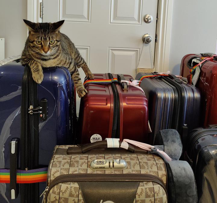 5月30日上午,家里的宠猫Elvis和我们一起吃送行饺子,他一直赖在行李箱上不让我们走;宠猫Presley自己跳进盒子里不出来,想让我们带她一起回国。猫咪有情有义,令人动容。