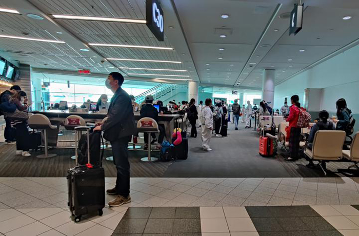 女儿女婿送我们到多伦多皮尔森国际机场。面罩、洗手液、防护服、N95口罩一应俱全,全副武装,外带6个拉杆箱。偌大的机场冷冷清清,早已不见往日热闹景象。我们沿着海航专用信道办理登记手续,一路有人看护,不能随便走动。在登机口还要办理中国海关验证码。