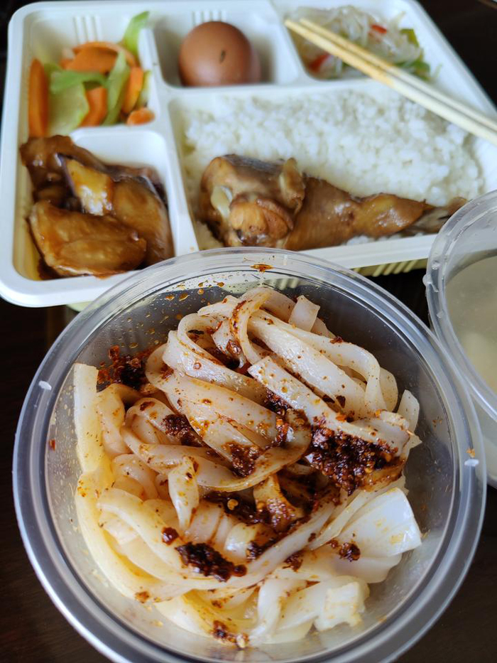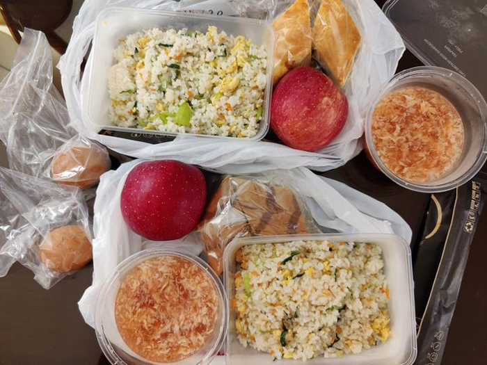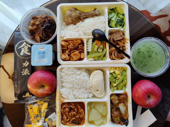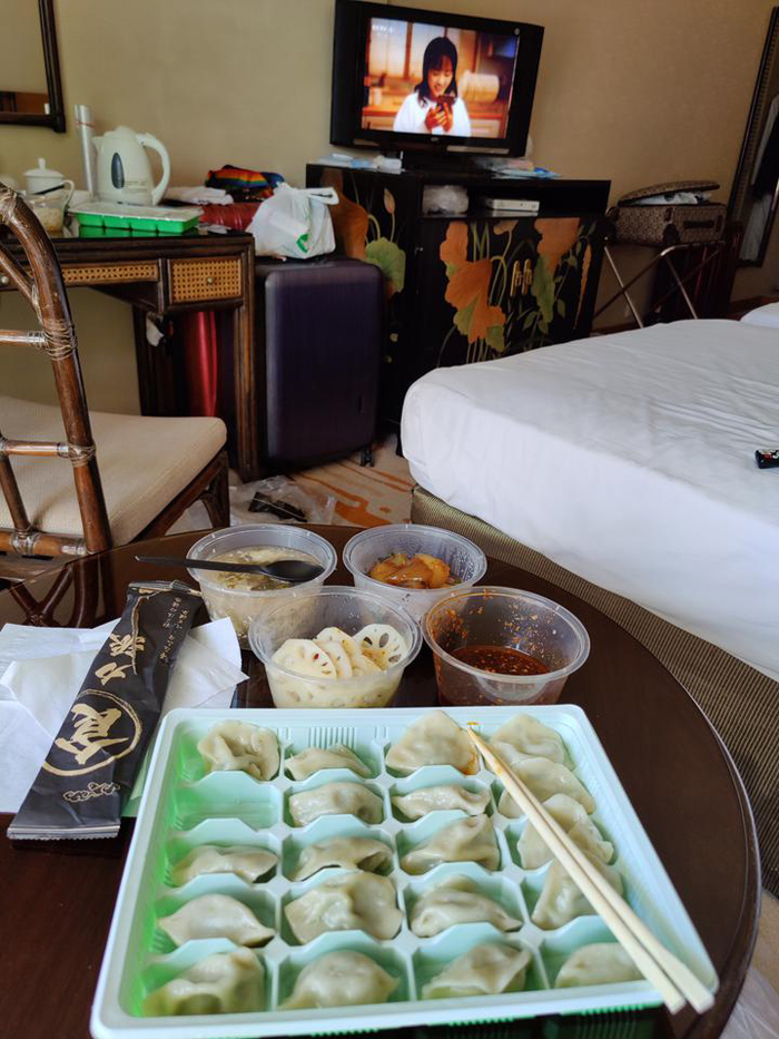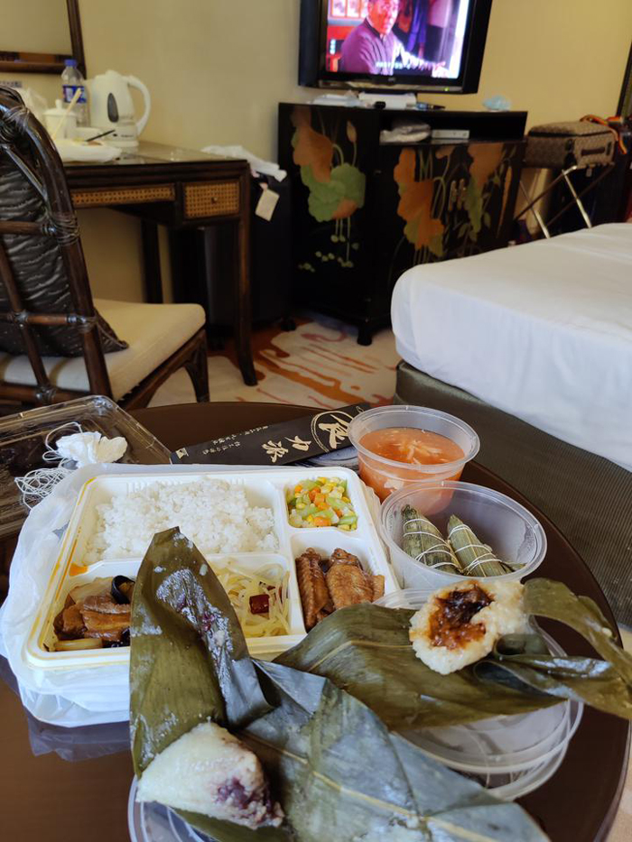 先说吃好。每天每人100元的伙食费标准,汤饭菜水果牛奶酸奶饼干矿泉水一应俱全,食物充足,营养均衡,包括千年陕菜特色美食也是轮番供应:凉皮、甑糕、麦饭、炒凉粉、肉夹馍、羊肉泡馍。端午节那天饭店给每人两个粽子,蜜枣和豆沙。当天我们还通过Zoom平台参加了“第三届加拿大国际端午文化艺术节活动线上直播”。有朋友开玩笑说,看到这吃的,有点向往被隔离的日子。当然也有遗憾,一是不提供酒品,二是不能点外卖。