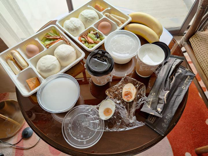6月1日0点15到达西安建国饭店,下车后由医护人员进行全身喷雾消毒,包括鞋底和行李。1点20在饭店外的大棚子里开始登记、扫码、缴费,一通忙乱。1点50入住房间 。2点40吃到饭店送来的第一餐,人已麻木早已全然不知饥渴。
