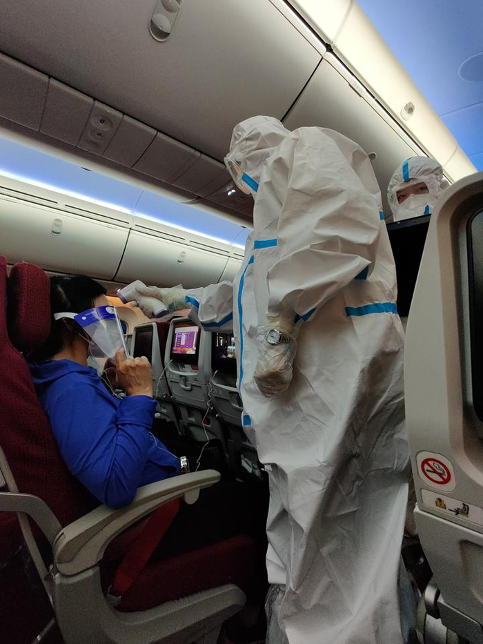女儿女婿送我们到多伦多皮尔森国际机场。面罩、洗手液、防护服、N95口罩一应俱全,全副武装,外带6个拉杆箱。偌大的机场冷冷清清,早已不见往日热闹景象。我们沿着海航专用信道办理登记手续,一路有人看护,不能随便走动。在登机口还要办理中国海关验证码。