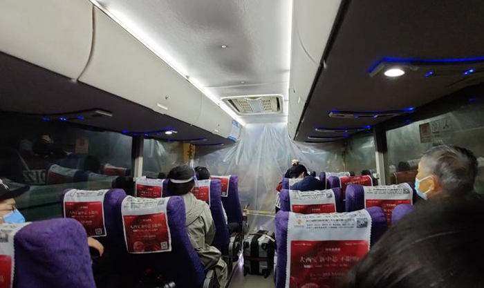 去隔离点的大巴车,用塑料布与驾驶室隔开