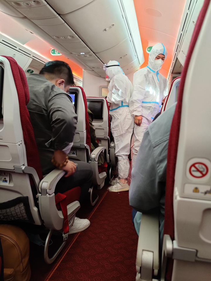 不同于三个月前回国情景,空乘人员没有穿防护服,一身职业装,我们也没有戴面罩,使用了N95口罩,多数人只是普通口罩,没有紧张气氛。因时差全程12个小时多在夜间飞行,第一次全程饱览空中美妙夜景。其间供应正餐两次,没有往日的红酒啤酒,一次测体温。不用在机上填写纸质物品申报单。看到不少留学生,因疫情各校报到时间不集中。