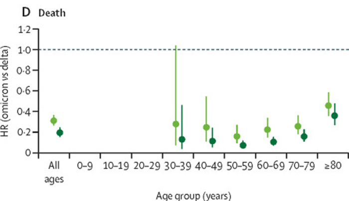 根据柳叶刀4月2日发布的一篇论文显示,当设定Delta的病死率为1时,Omicron的病死率大约为0.31(范围为0.26~0.37),确实比之前的毒株有明显下降。