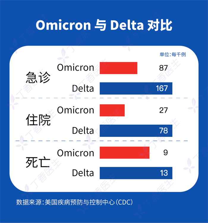今年1月底,美国疾控中心发布的一份报告显示,Omicron的急诊、住院和死亡的比率均低于Delta。