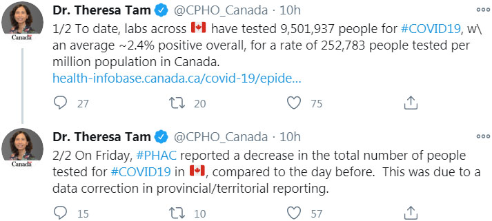 —— 加拿大首席公共卫生官谭咏诗(Theresa Tam)博士在11月1日发布数据称,截止11月1日,加拿大共检测了9,501,937,确诊率为2.4%(世界卫生组织设定的目标是使阳性确诊率保持在5%以下),每100万人口中共有252,783人接受测试。