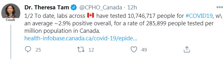 —— 加拿大首席公共卫生官谭咏诗(Theresa Tam)博士在11月21日发布数据称,截止11月21日,加拿大共检测了10,746,717,确诊率为2.9%(世界卫生组织设定的目标是使阳性确诊率保持在5%以下),每100万人口中共有285,899人接受测试。
