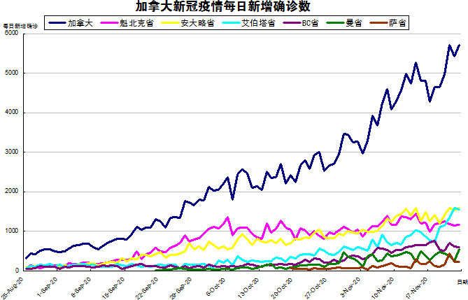 随着周末的结束,BC省终于更新数据了,加国生活网小编将当天新增的7052例进行了分解。由于加拿大目前的疫情格局已经不再是魁省和安省确诊病例最多的情况了,其他几个省份也渐渐开始加重起来,“第二波”疫情已经到来,所以加国生活网小编统计了从8月25日至11月23日的五个省份的新增确诊数,并制作了如下曲线图,大家可以了解一下加拿大目前新冠疫情的发展趋势。加拿大当日新增5713例,按新增确诊数由多至少的排列分别是:安省新增1589、艾省新增1549、魁省新增1164、BC省新增594、曼省新增543、萨省新增235。从下图可以看出,艾省已经赶超魁省,以前第一梯队的是二个省份(安省和魁省),现在变成了三个省份(安省、魁省和艾省);第二梯队省份也有三个(BC省、曼省和萨省),曼省有赶超BC省的趋势。