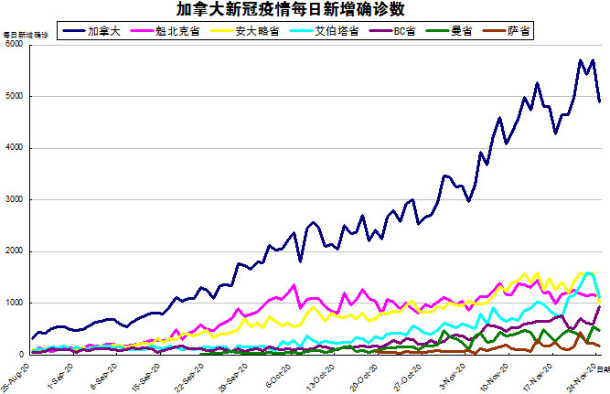由于加拿大目前的疫情格局已经不再是魁省和安省确诊病例最多的情况了,其他几个省份也渐渐开始加重起来,“第二波”疫情已经到来,所以加国生活网小编统计了从8月25日至11月24日的五个省份的新增确诊数,并制作了如下曲线图,大家可以了解一下加拿大目前新冠疫情的发展趋势。加拿大当日新增4889例,按新增确诊数由多至少的排列分别是:魁省新增1124、艾省新增1115、安省新增1009、BC省新增941、曼省新增471、萨省新增175。