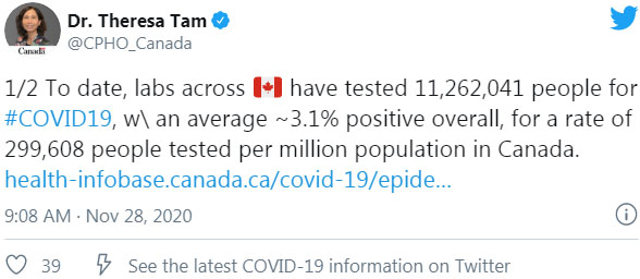 —— 加拿大首席公共卫生官谭咏诗(Theresa Tam)博士在11月28日发布数据称,截止11月28日,加拿大共检测了11,262,041,确诊率上升至3.1%(世界卫生组织设定的目标是使阳性确诊率保持在5%以下),每100万人口中共有299,608人接受测试。