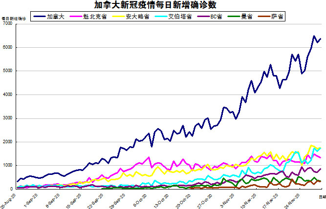 随着周末的结束,BC省终于更新数据了,加国生活网小编将当天新增的7861例进行了分解。由于加拿大目前的疫情格局已经不再是魁省和安省确诊病例最多的情况了,其他几个省份也渐渐开始加重起来,“第二波”疫情已经到来,所以加国生活网小编统计了从8月25日至11月30日的五个省份的新增确诊数,并制作了如下曲线图,大家可以了解一下加拿大目前新冠疫情的发展趋势。加拿大当日新增6380例,按新增确诊数由多至少的排列分别是:安省新增1746、艾省新增1733、魁省新增1333、BC省新增873、曼省新增342、萨省新增325。