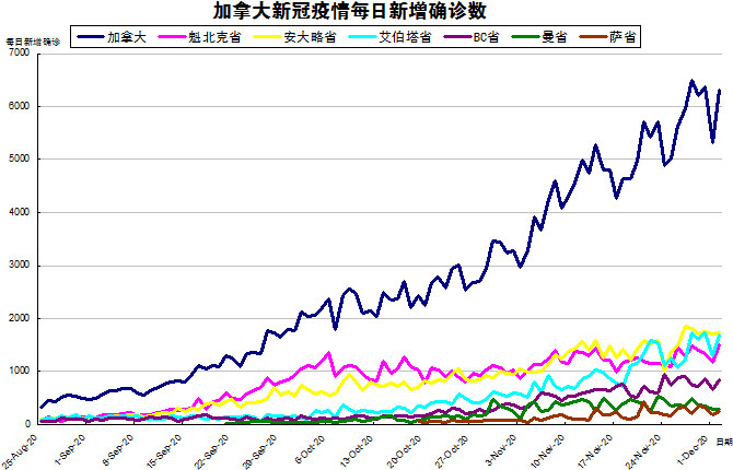 由于加拿大目前的疫情格局已经不再是魁省和安省确诊病例最多的情况了,其他几个省份也渐渐开始加重起来,“第二波”疫情已经到来,所以加国生活网小编统计了从8月25日至12月2日的五个省份的新增确诊数,并制作了如下曲线图,大家可以了解一下加拿大目前新冠疫情的发展趋势。加拿大当日新增6307例,按新增确诊数由多至少的排列分别是:安省新增1723、艾省新增1685、魁省新增1514、BC省新增834、曼省新增277、萨省新增237。