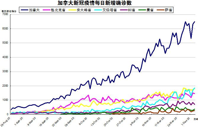 由于加拿大目前的疫情格局已经不再是魁省和安省确诊病例最多的情况了,其他几个省份也渐渐开始加重起来,“第二波”疫情已经到来,所以加国生活网小编统计了从8月25日至12月3日的五个省份的新增确诊数,并制作了如下曲线图,大家可以了解一下加拿大目前新冠疫情的发展趋势。加拿大当日新增6495例,按新增确诊数由多至少的排列分别是:艾省新增1854、安省新增1824、魁省新增1470、BC省新增694、曼省新增367、萨省新增262。艾省“一路赶超”啊,最终成为每天新增病例最高的省份,而安省的1824例中包括Middlesex-London区的过去三天漏掉的127例。