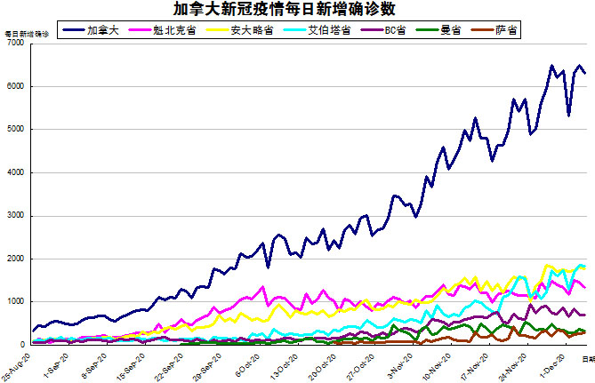 由于加拿大目前的疫情格局已经不再是魁省和安省确诊病例最多的情况了,其他几个省份也渐渐开始加重起来,“第二波”疫情已经到来,所以加国生活网小编统计了从8月25日至12月4日的五个省份的新增确诊数,并制作了如下曲线图,大家可以了解一下加拿大目前新冠疫情的发展趋势。加拿大当日新增6302例,按新增确诊数由多至少的排列分别是:艾省新增1828、安省新增1780、魁省新增1345、BC省新增710、曼省新增318、萨省新增283。艾省“再次领跑各省,成为每天新增病例最高的省份!