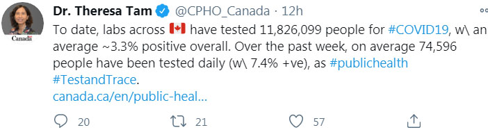 —— 加拿大首席公共卫生官谭咏诗(Theresa Tam)博士在12月5日发布数据称,截止12月5日,加拿大共检测了11,826,099,确诊率上升至3.3%(世界卫生组织设定的目标是使阳性确诊率保持在5%以下),每天有74,596人接受测试。