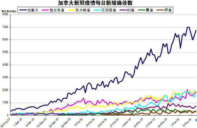 由于加拿大目前的疫情格局已经不再是魁省和安省确诊病例最多的情况了,其他几个省份也渐渐开始加重起来,“第二波”疫情已经到来,所以加国生活网小编统计了从8月25日至12月10日的五个省份的新增确诊数,并制作了如下曲线图,大家可以了解一下加拿大目前新冠疫情的发展趋势。加拿大当日新增6739例,按新增确诊数由多至少的排列分别是:安省新增1983、魁省新增1842、艾省新增1566、BC省新增723、萨省新增324、曼省新增292。看来,萨省已经接连二天超过了曼省。