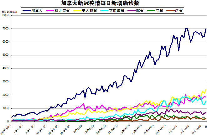 —— 虽然加拿大各省都在尽全力遏制新冠病毒的传播,但加拿大在12月17日还是新增了7008多例确诊病例,并且是自疫情以来首次超过7千例。在当天的新增病例中,安省“一骑绝尘”新增2432例,不仅连续第三天超过2千例,而且三创安省自疫情以来的单日最高纪录。
