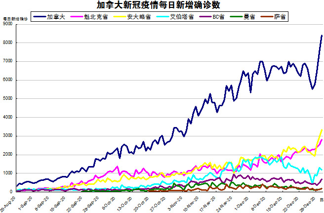 由于加拿大目前的疫情格局已经不再是“第一波”疫情时魁省和安省确诊病例最多的情况了,其他几个省份也渐渐开始加重起来,“第二波”疫情已经到来,所以加国生活网小编统计了从8月25日至12月31日的五个省份的新增确诊数,并制作了如下曲线图,大家可以了解一下加拿大目前新冠疫情的发展趋势。加拿大当日新增8413例,按新增确诊数由多至少的排列分别是:安省新增3328、魁省新增2819、艾省新增1200、BC省新增683、萨省新增190、曼省新增187。加拿大疫情数字在圣诞节过后陡然上升,这一方面是和圣诞节期间测试量减少有关,另一方面也是圣诞假期节日聚会有关,这其中,安省和魁省的当天新增确诊病例又是连续第三天创自疫情以来的最高纪录。