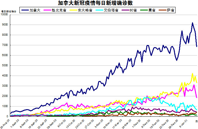 随着周末的结束,BC省终于更新数据了,加国生活网小编将当天新增的7893例进行了分解。由于加拿大目前的疫情格局已经不再是魁省和安省确诊病例最多的情况了,其他几个省份也渐渐开始加重起来,“第二波”疫情已经到来,所以加国生活网小编统计了从2020年8月25日至2021年1月11日的五个省份的新增确诊数,并制作了如下曲线图,大家可以了解一下加拿大目前新冠疫情的发展趋势。加拿大当日新增6848例,按新增确诊数由多至少的排列分别是:安省新增3338、魁省新增1869、艾省新增639、BC省新增430、萨省新增412、曼省新增134。