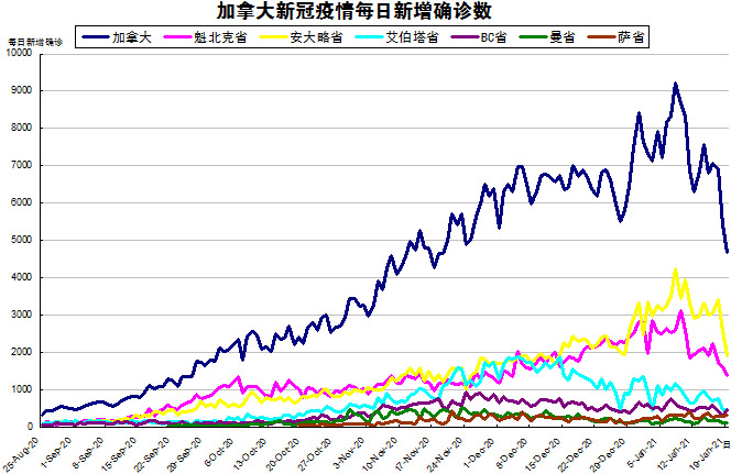 由于加拿大目前的疫情格局已经不再是魁省和安省确诊病例最多的情况了,其他几个省份也渐渐开始加重起来,“第二波”疫情已经到来,所以加国生活网小编统计了从2020年8月25日至2021年1月19日的五个省份的新增确诊数,并制作了如下曲线图,大家可以了解一下加拿大目前新冠疫情的发展趋势。加拿大当日新增4679例,按新增确诊数由多至少的排列分别是:安省新增1913、魁省新增1386、BC省新增465、艾省新增456、萨省新增309、曼省新增111。