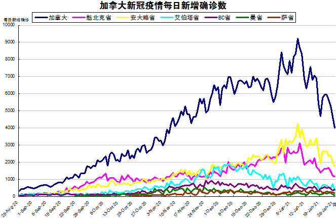 由于加拿大目前的疫情格局已经不再是魁省和安省确诊病例最多的情况了,其他几个省份也渐渐开始加重起来,“第二波”疫情已经到来,所以加国生活网小编统计了从2020年8月25日至2021年1月26日的五个省份的新增确诊数,并制作了如下曲线图,大家可以了解一下加拿大目前新冠疫情的发展趋势。加拿大当日新增4011例,按新增确诊数由多至少的排列分别是:安省新增1740、魁省新增1166、BC省新增406、艾省新增366、萨省新增230、曼省新增92。