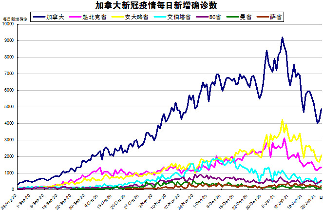 由于加拿大目前的疫情格局已经不再是魁省和安省确诊病例最多的情况了,其他几个省份也渐渐开始加重起来,“第二波”疫情已经到来,所以加国生活网小编统计了从2020年8月25日至2021年1月28日的五个省份的新增确诊数,并制作了如下曲线图,大家可以了解一下加拿大目前新冠疫情的发展趋势。加拿大当日新增4877例,按新增确诊数由多至少的排列分别是:安省新增2093、魁省新增1368、BC省新增546、艾省新增461、萨省新增244、曼省新增132。