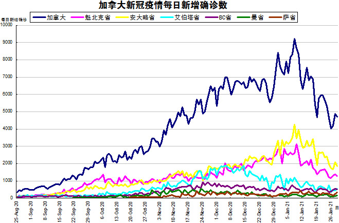 由于加拿大目前的疫情格局已经不再是魁省和安省确诊病例最多的情况了,其他几个省份也渐渐开始加重起来,“第二波”疫情已经到来,所以加国生活网小编统计了从2020年8月25日至2021年1月29日的五个省份的新增确诊数,并制作了如下曲线图,大家可以了解一下加拿大目前新冠疫情的发展趋势。加拿大当日新增4690例,按新增确诊数由多至少的排列分别是:安省新增1837、魁省新增1295、BC省新增543、艾省新增514、萨省新增328、曼省新增152。