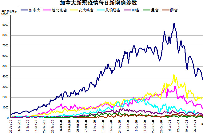 1月22日:加拿大全国每日新增确诊病例数正呈下降趋势,但仍不能过早放松卫生限制