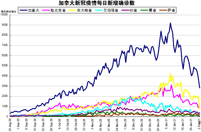 由于加拿大目前的疫情格局已经不再是魁省和安省确诊病例最多的情况了,其他几个省份也渐渐开始加重起来,“第二波”疫情已经到来,所以加国生活网小编统计了从2020年8月25日至2021年2月2日的五个省份的新增确诊数,并制作了如下曲线图,大家可以了解一下加拿大目前新冠疫情的发展趋势。加拿大当日新增2828例,按新增确诊数由多至少的排列分别是:魁省新增1053、安省新增745、BC省新增429、艾省新增268、曼省新增225、萨省新增82。