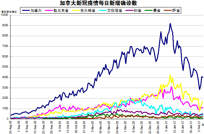 由于加拿大目前的疫情格局已经不再是魁省和安省确诊病例最多的情况了,其他几个省份也渐渐开始加重起来,“第二波”疫情已经到来,所以加国生活网小编统计了从2020年8月25日至2021年2月5日的五个省份的新增确诊数,并制作了如下曲线图,大家可以了解一下加拿大目前新冠疫情的发展趋势。加拿大当日新增4022例,按新增确诊数由多至少的排列分别是:安省新增1670、魁省新增1101、BC省新增471、艾省新增396、萨省新增266、曼省新增110。