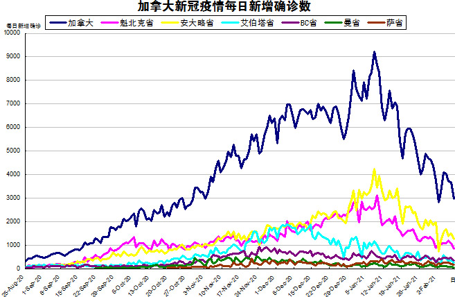 随着周末的结束,BC省终于更新数据了,加国生活网小编将当天新增的3860例进行了分解。“第二波”疫情目前虽然呈下降趋势,但随着变异新冠病毒开始在社区内传播,疫情随时都会卷土重来,加国生活网小编专门统计了从2020年8月25日至2021年2月8日的五个省份的新增确诊数,并制作了如下曲线图,让大家能一目了然地了解加拿大新冠疫情的发展趋势。加拿大当日新增2967例,按新增确诊数由多至少的排列分别是:安省新增1265、魁省新增853、BC省新增343、艾省新增269、萨省新增171、曼省新增52。