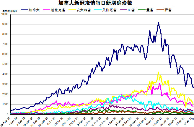 “第二波”疫情目前虽然呈下降趋势,但随着变异新冠病毒开始在社区内传播,疫情随时都会卷土重来,加国生活网小编专门统计了从2020年8月25日至2021年2月9日的五个省份的新增确诊数,并制作了如下曲线图,让大家能一目了然地了解加拿大新冠疫情的发展趋势。加拿大当日新增2677例,按新增确诊数由多至少的排列分别是:安省新增1022、魁省新增826、BC省新增435、艾省新增195、萨省新增80、曼省新增71。