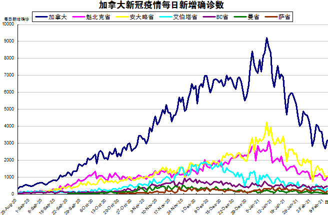 “第二波”疫情目前虽然呈下降趋势,但随着变异新冠病毒开始在社区内传播,疫情随时都会卷土重来,加国生活网小编专门统计了从2020年8月25日至2021年2月10日的五个省份的新增确诊数,并制作了如下曲线图,让大家能一目了然地了解加拿大新冠疫情的发展趋势。加拿大当日新增3189例,按新增确诊数由多至少的排列分别是:安省新增1072、魁省新增989、BC省新增469、艾省新增339、萨省新增189、曼省新增57。