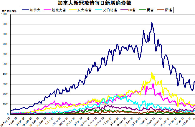 “第二波”疫情目前虽然呈下降趋势,但随着变异新冠病毒开始在社区内传播,疫情随时都会卷土重来,加国生活网小编专门统计了从2020年8月25日至2021年2月18日的五个省份的新增确诊数,并制作了如下曲线图,让大家能一目了然地了解加拿大新冠疫情的发展趋势。加拿大当日新增3315例,按新增确诊数由多至少的排列分别是:安省新增1038、魁省新增900、BC省新增617、艾省新增415、萨省新增146、曼省新增138。