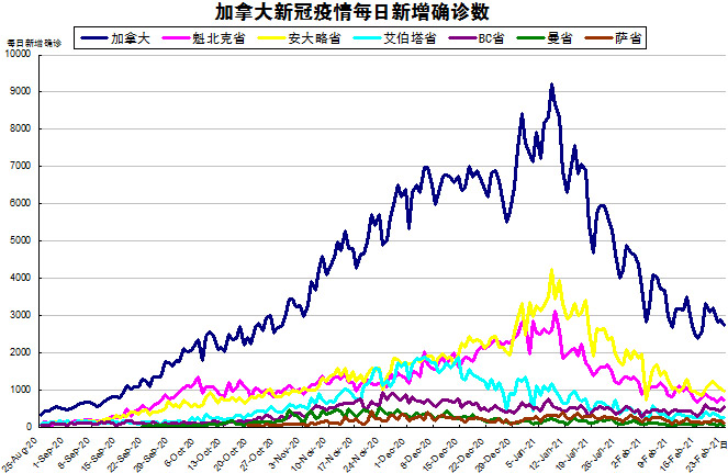 “第二波”疫情目前虽然呈下降趋势,但随着变异新冠病毒开始在社区内传播,疫情随时都会卷土重来,加国生活网小编专门统计了从2020年8月25日至2021年2月23日的五个省份的新增确诊数,并制作了如下曲线图,让大家能一目了然地了解加拿大新冠疫情的发展趋势。加拿大当日新增2752例,按新增确诊数由多至少的排列分别是:安省新增975、魁省新增739、BC省新增559、艾省新增267、萨省新增126、曼省新增68。