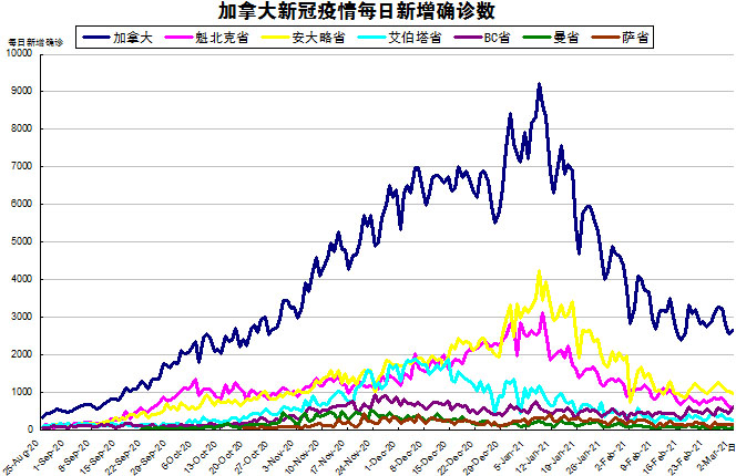 “第二波”疫情目前虽然呈下降趋势,但随着变异新冠病毒开始在社区内传播,疫情随时都会卷土重来,加国生活网小编专门统计了从2020年8月25日至2021年3月2日的五个省份的新增确诊数,并制作了如下曲线图,让大家能一目了然地了解加拿大新冠疫情的发展趋势。加拿大当日新增2646例,按新增确诊数由多至少的排列分别是:安省新增966、BC省新增627、魁省新增588、艾省新增257、萨省新增137、曼省新增56。